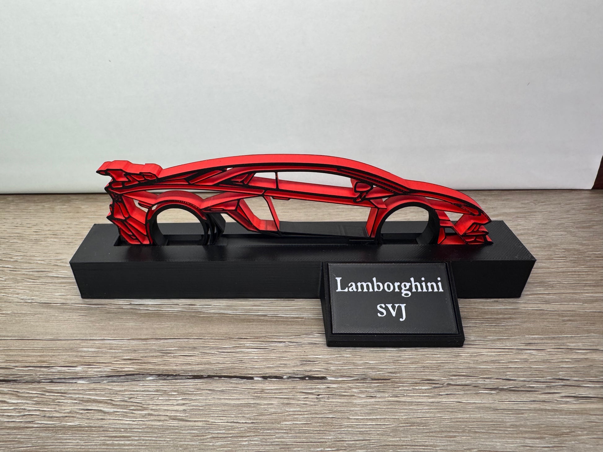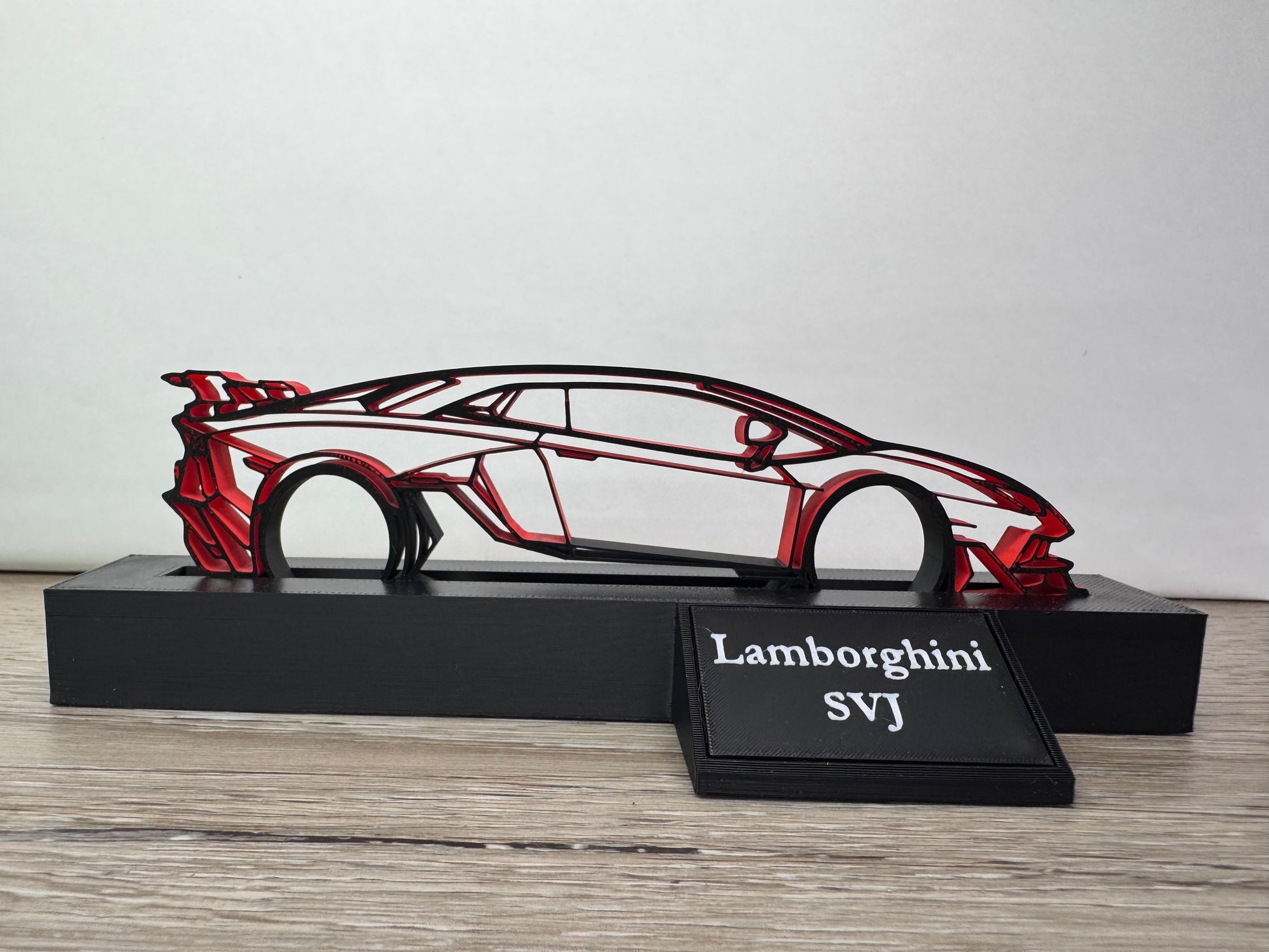 Celebrate the unmatched presence of the Lamborghini Aventador SVJ with this bold silhouette model. From its razor-sharp lines to its race-bred aerodynamics, every detail is captured to reflect the raw power and drama of this V12 legend. Whether it’s on your desk or display shelf, this handcrafted piece channels the spirit of speed and Italian craftsmanship. Perfect for collectors and supercar fans, it’s a tribute to one of the most extreme Lamborghinis ever built.