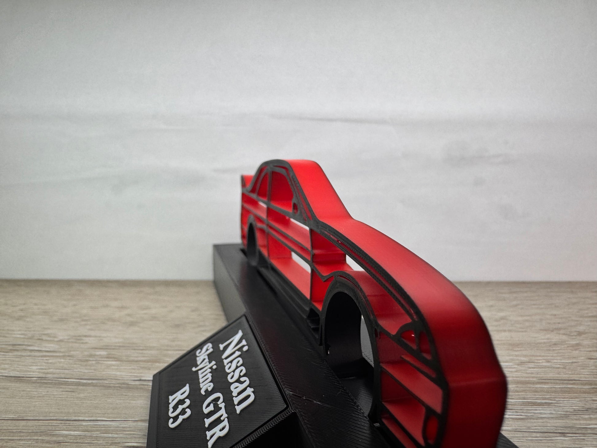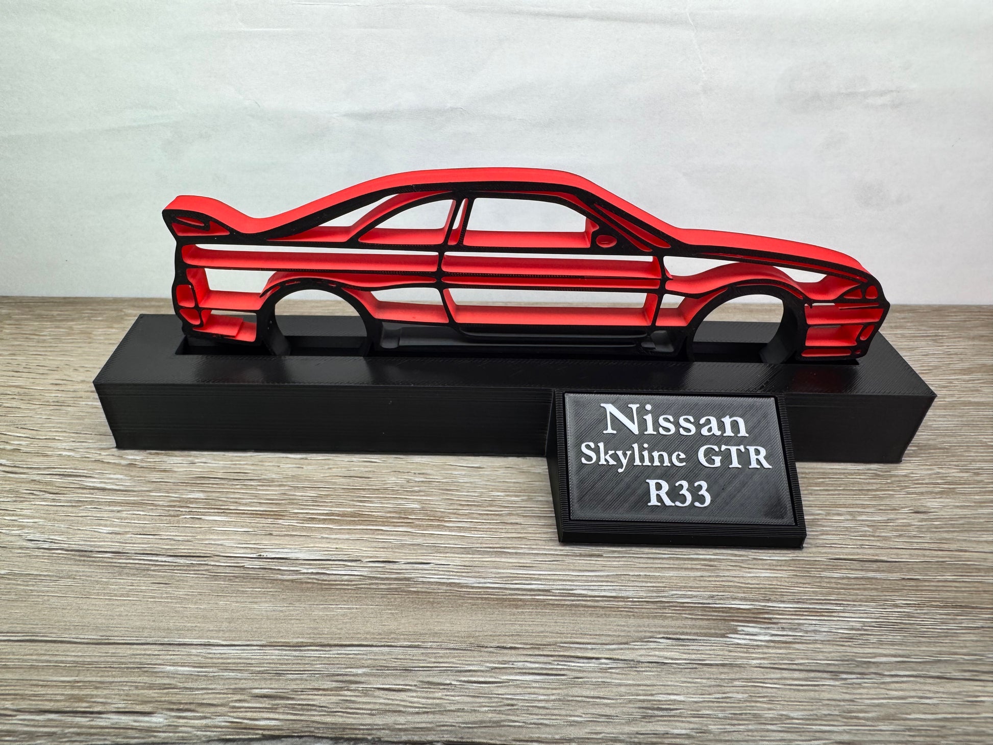 Celebrate the refined power of the R33 Skyline GT-R with this bold silhouette model. Every curve and contour is carefully captured, showcasing the balanced design and performance legacy of this iconic machine. Whether displayed on your desk or shelf, this handcrafted piece brings the spirit of Japanese engineering and racing heritage to life. Perfect for car lovers and collectors, it’s a sleek tribute to a true GT-R classic.